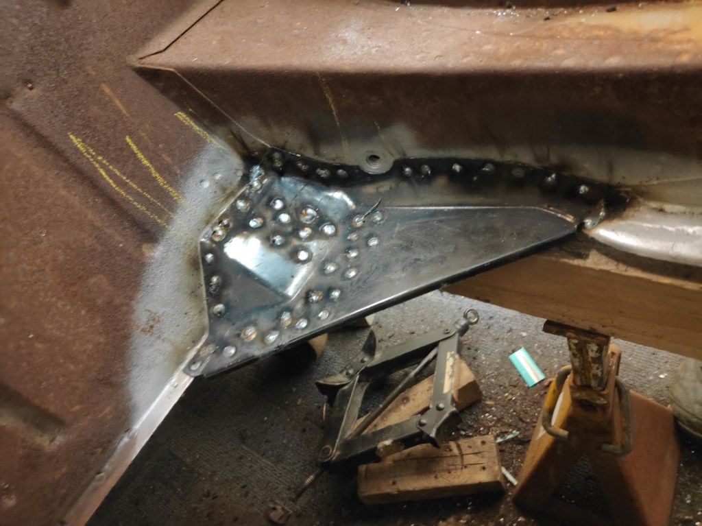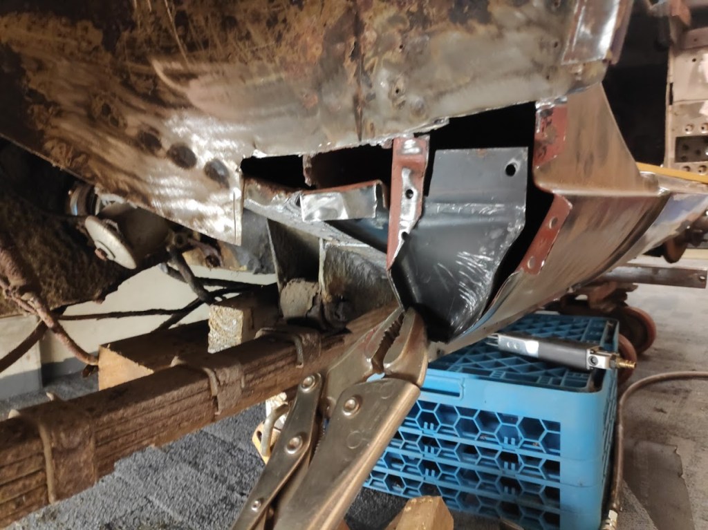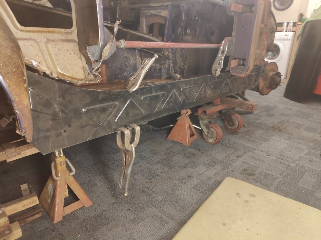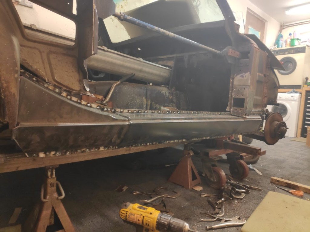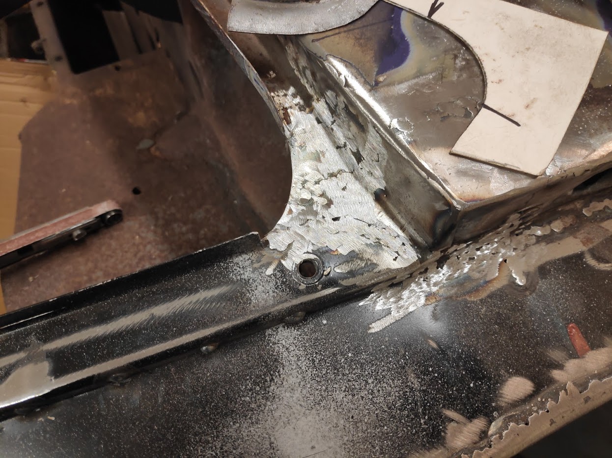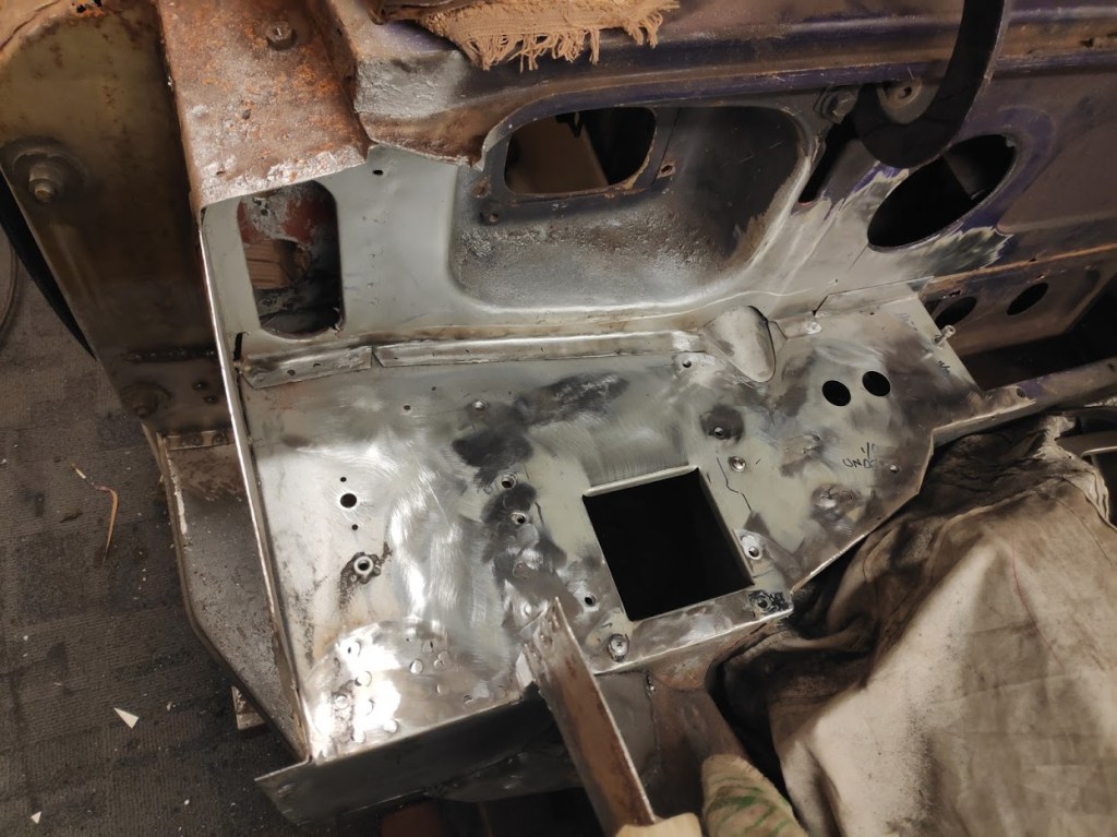 And finally for this side the floor pan. The chassis outrigger leg and jacking point will get done once the car is on the rotisserie, easier that laying on your back with welding splatter rattling about in your ear. Also the obligatory grinding session for the mig plugs in the flor pan.