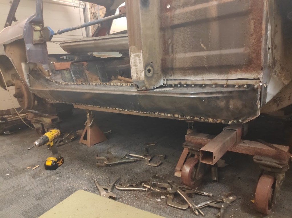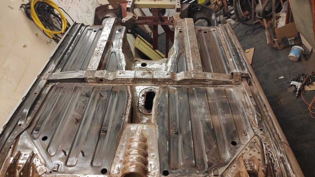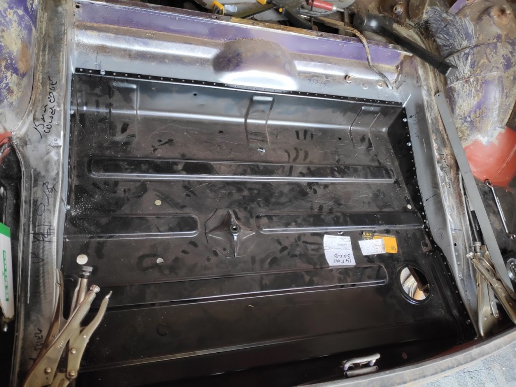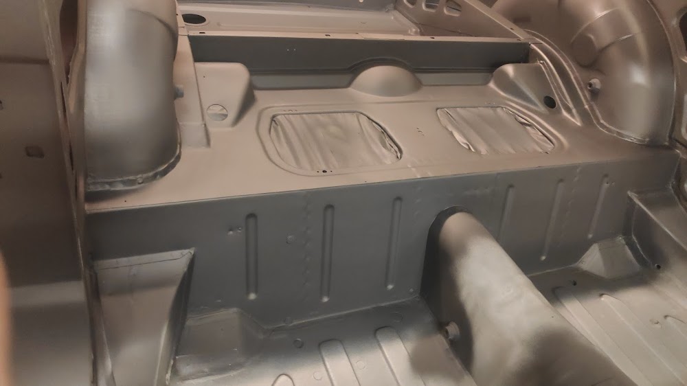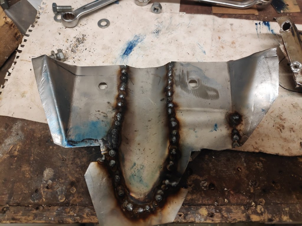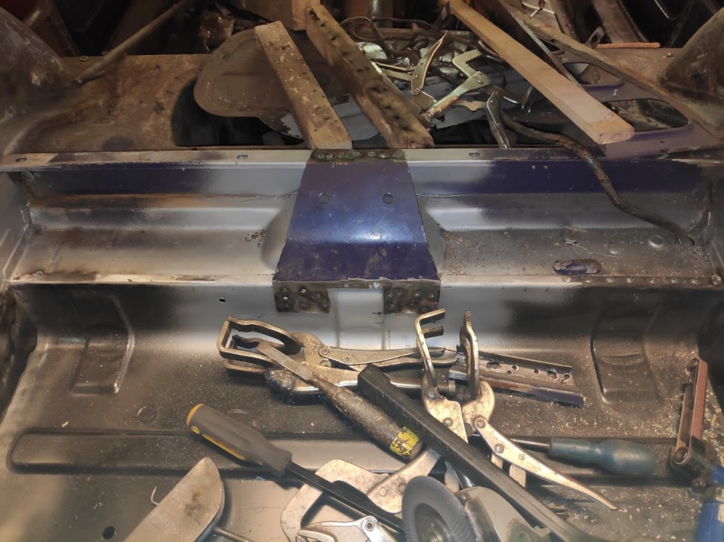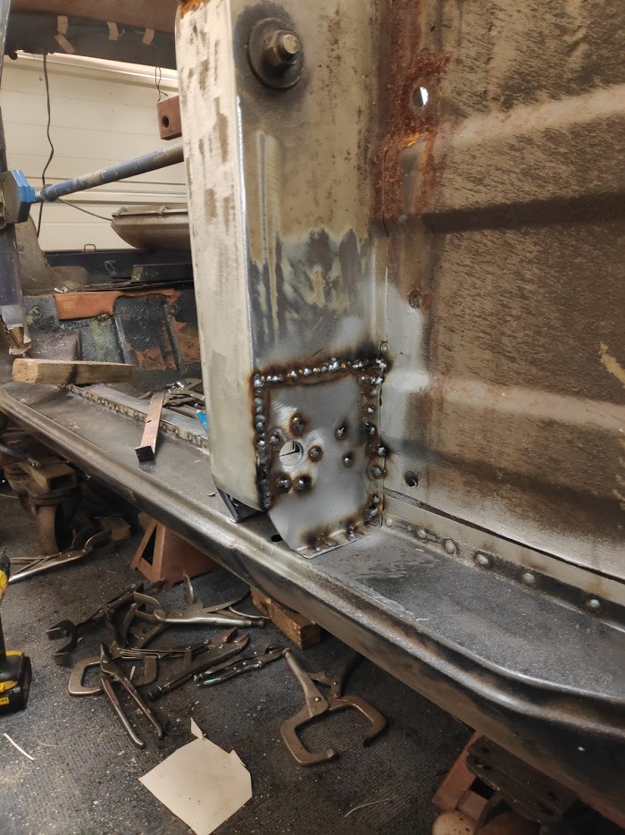 And finally for this side the floor pan. The chassis outrigger leg and jacking point will get done once the car is on the rotisserie, easier that laying on your back with welding splatter rattling about in your ear. Also the obligatory grinding session for the mig plugs in the flor pan.