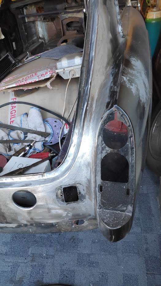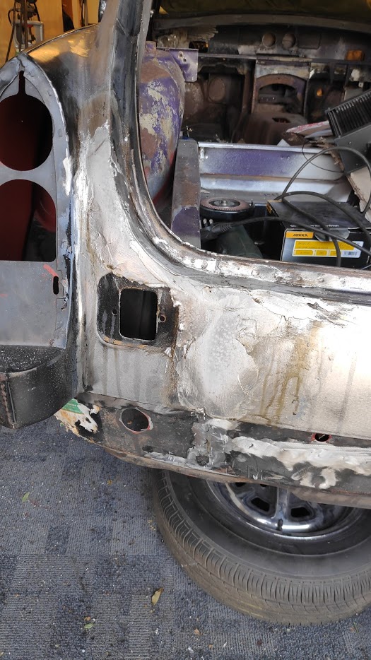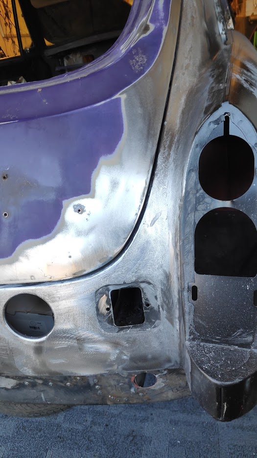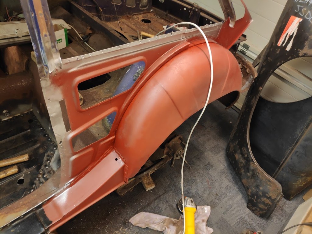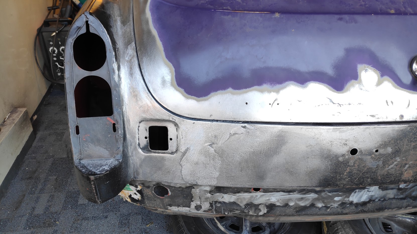 With a good grind and wire brush applied a coat of epoxy sealer to all the inner sections and rear wing internals and trial fitted the rear wing and door. Much better