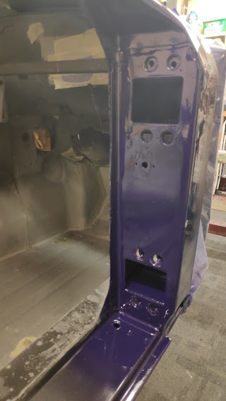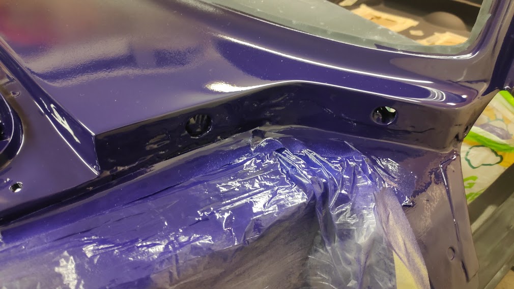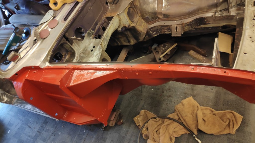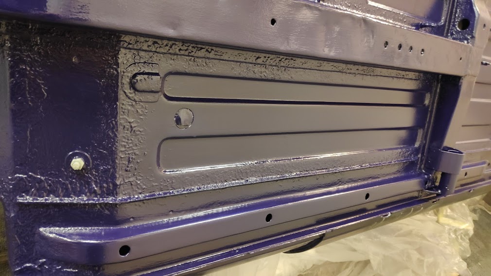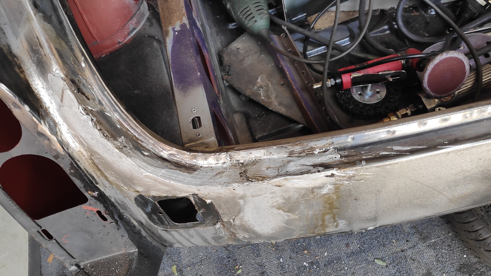 With a good grind and wire brush applied a coat of epoxy sealer to all the inner sections and rear wing internals and trial fitted the rear wing and door. Much better