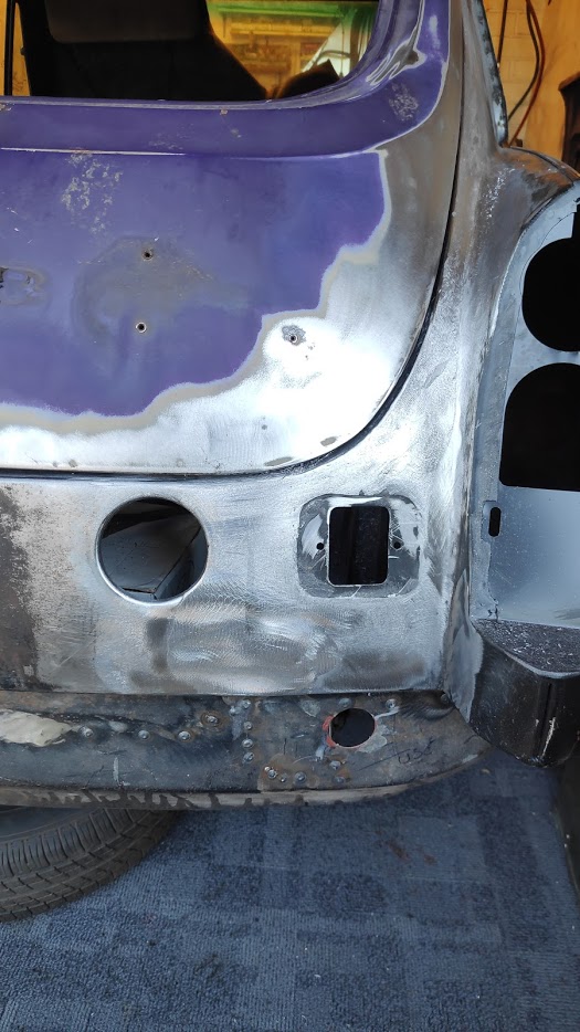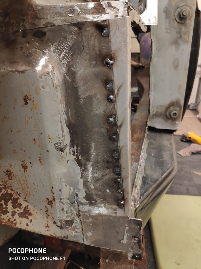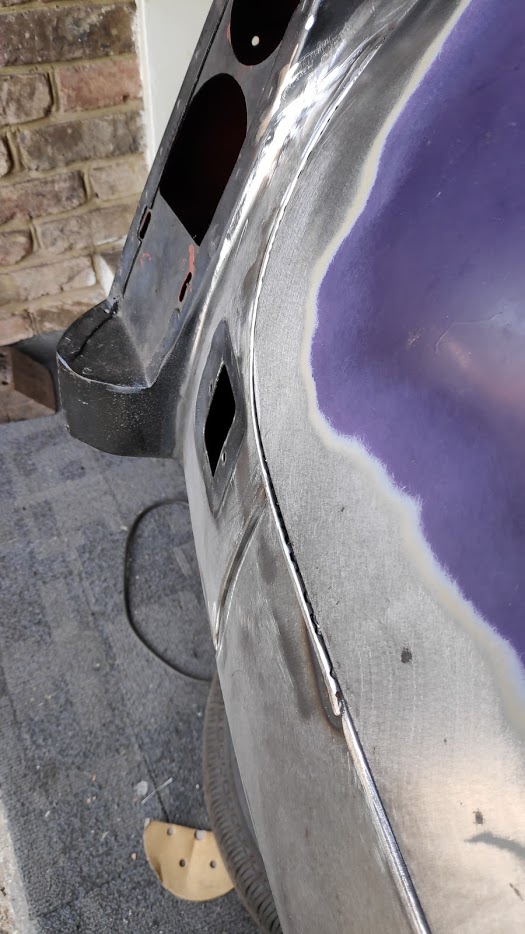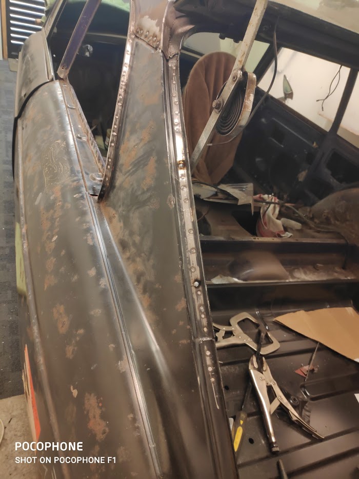 Managed to spotweld the rear on as much as posible, hopefully avoiding the grind and just being able to prep and paint over to give some sort of factory fit. Just the small fillet of the B post to wing to do.