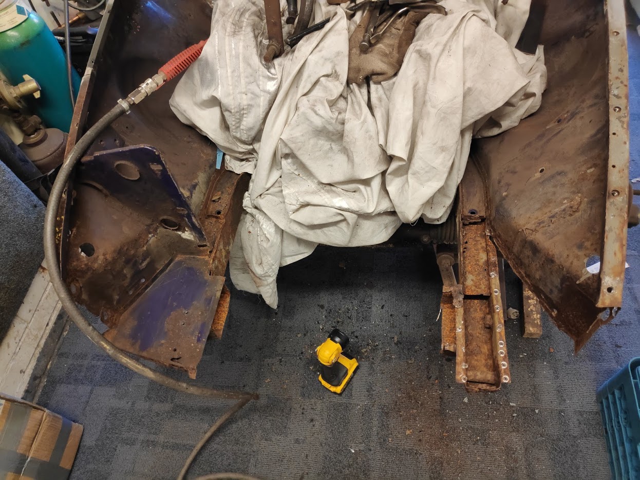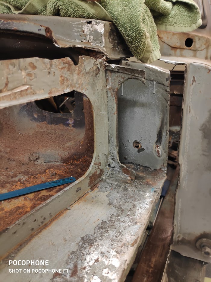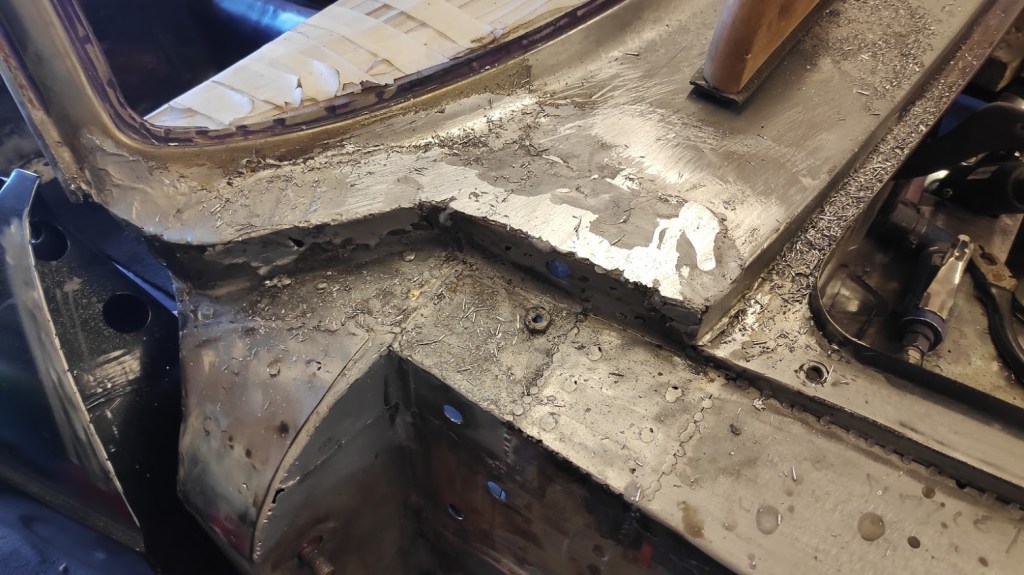 And on to the O/S, most the outer and inner sill fell away, along with the lower edge of the inner door step sill flange to castle rail. The main step is fine and doesn’t need replacing so the lower sections will get made and replace along with the flange to castle. A post bottoms, bits of the inner footwell panel, all the normal places.