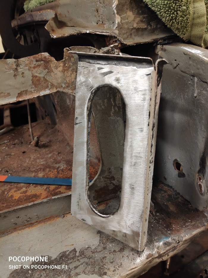 The front turret inner wing reinforcer again had been fitted but it all seemed a little bit off and I wanted to repair the foot well areas so they looked factory. They didn’t need any major panels, just the usual repair pieces. The foot well panel seemed to pull the side in, I found it had been repaired, technical term, pissed, so you can see the tapered fillet needed to get it to align. I have either butt welded or joddled where not seen as I want the appearance to seem factory or as near as possible without repairs. The other bit that was rusty was the support panel in the 2nd pic, not being available I had to make one up and fit this.