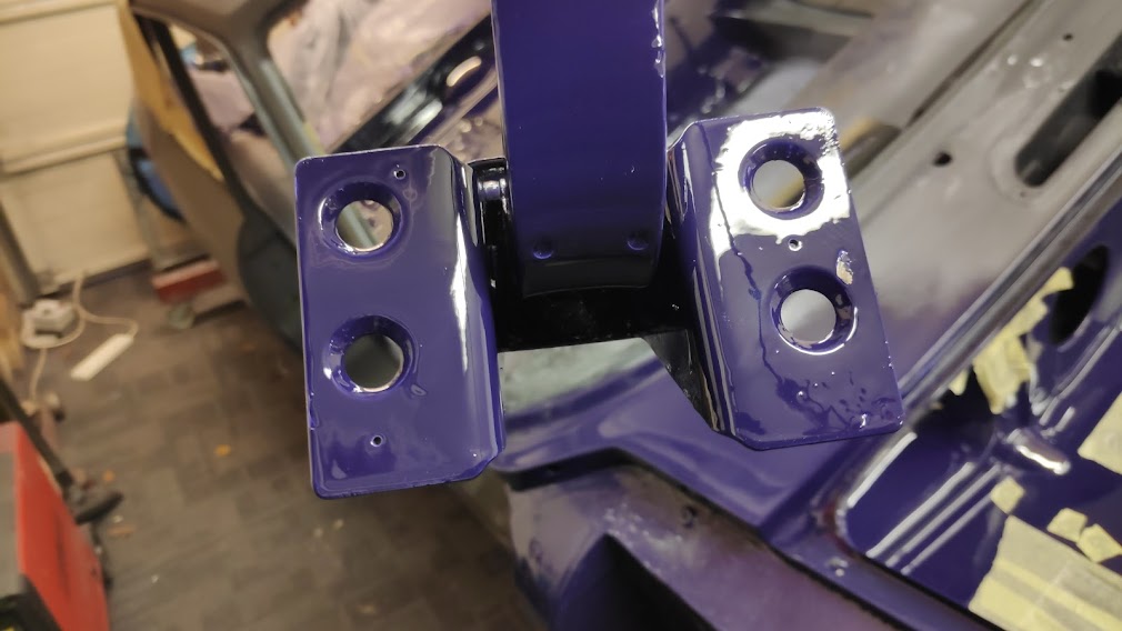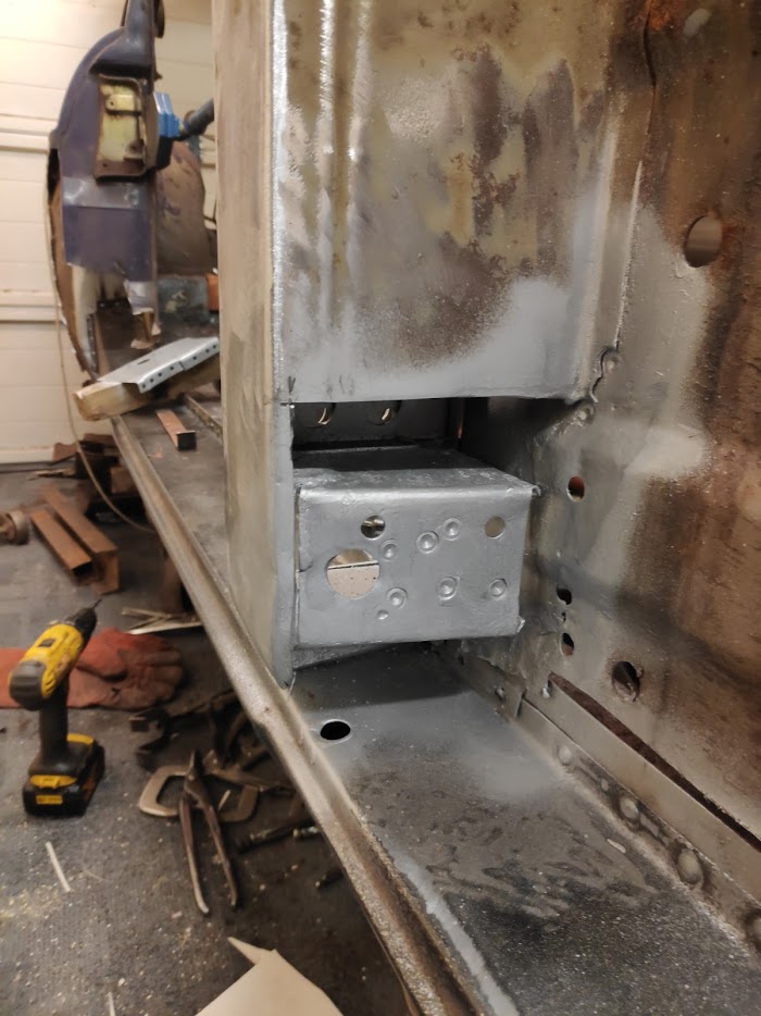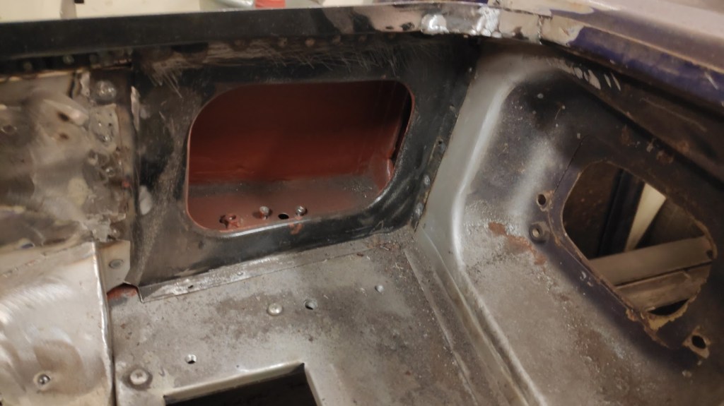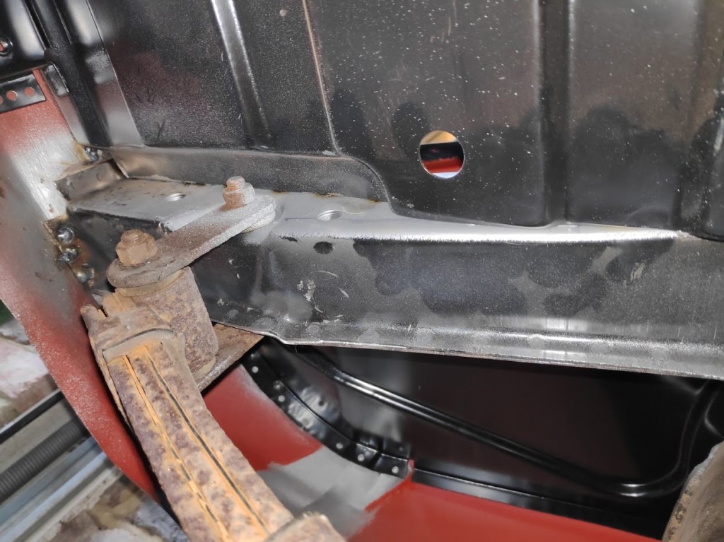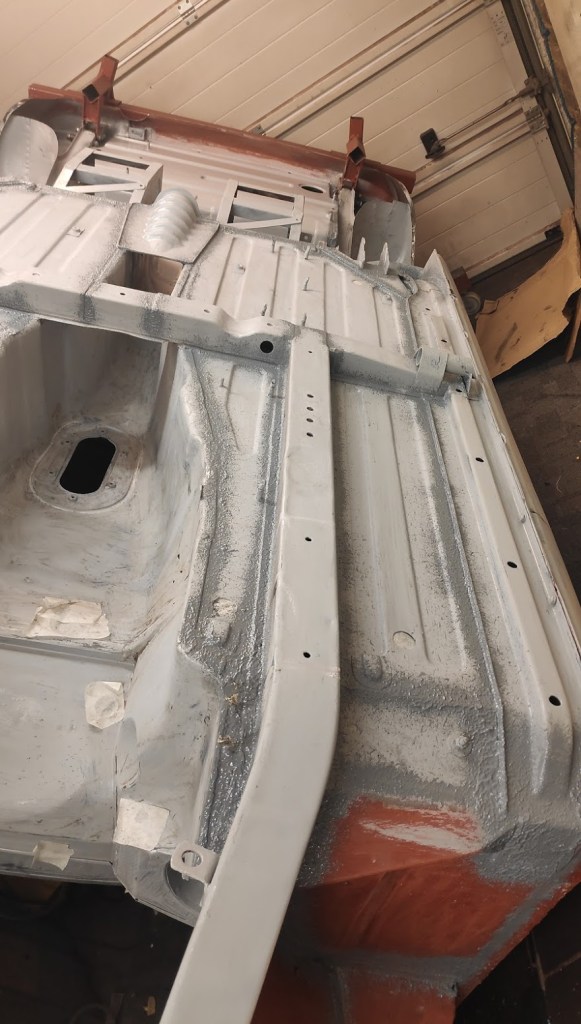 The rear heelboard extension piece was rusty and cut out. Again a where not being welded a coat of epoxy sealer and then on the weld thru edges a coat or zinc weld primer. Also a small section of the spring hanger needed replacing, hadn’t rusted thru yet but now it was easier now than later on. Got carried away with the hole punch here but this was almost the same amount that the OE piece had in it, just means a load of grinding coming up.