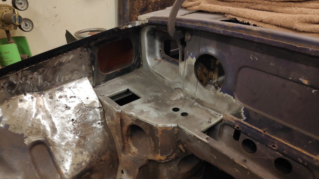 The next area I had to tackle was the pedal box area, there was a fair amount of rot in this area and really the only way was to unpick it, cut it all out and rebuild. MGB Hive did a bulkhead panel for the pedal box area, it wasn’t bad as fit goes but it did need modifying and all of the fixings welded into place and some of the holes welded up.