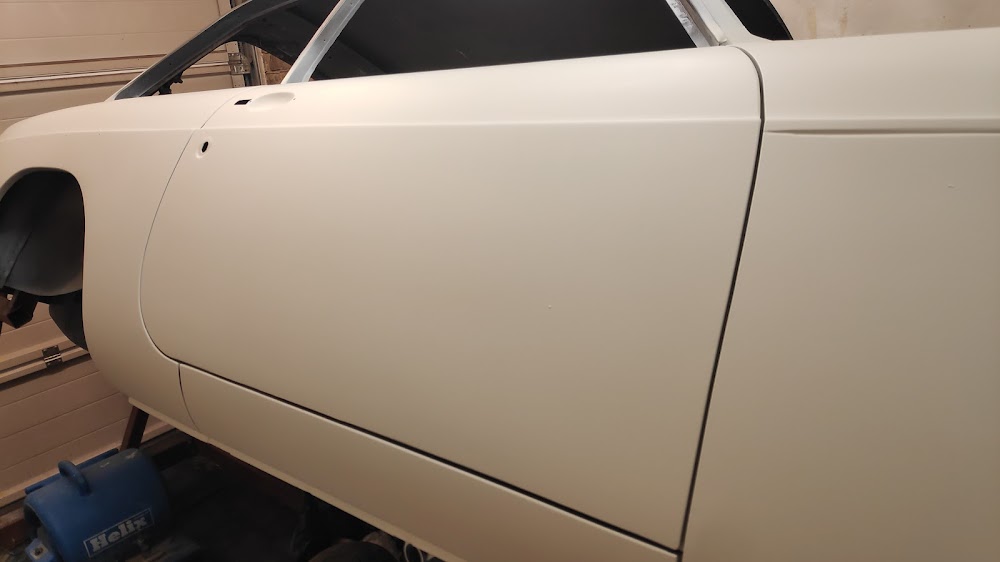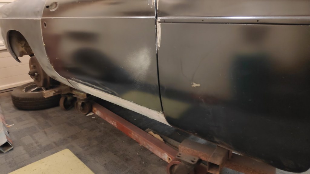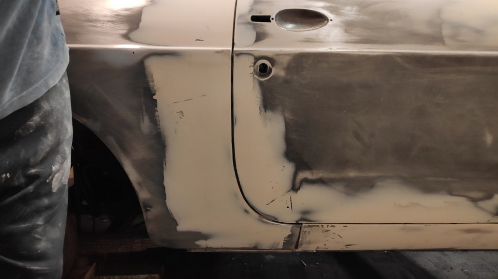 With the metal more or less aligned a thin coat of filler was applied to the areas needing attention, mainly where I had to do some bumping to get the profiles the same, and also in places where the edges had to be ground and in some cases the welding wire trick to extend the door edges to get a respectable and parallel good gap to sills and wings. Also given the standard of paint work the actual metal panels had untold pressing marks, high and low spots and just poor panel finish.