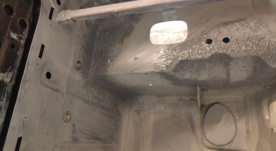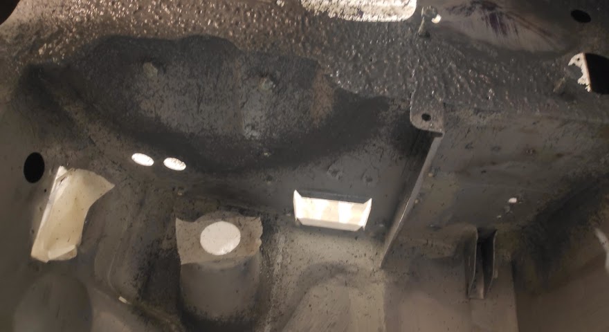 And on to the horrible job of finishing the grinding on the floor, stripping off all of the old underseal and sorting out the old steel ready for treatment. At present the floor has a coat of epoxy primer, all of the joints will be seam sealed and then on the vital overlapping joints I will use the 3M 2k Two Part Sprayable Sealer 08800, its ridiculously expensive at aprox £20 for 250ml, which covers not a lot, prob going to need 5-6 sachets, however its the best stuff in the world I have found, it produces modern factory seam sealer finish and nothing get thru it. Once that lot is done then the whole lot will get a coat of Raptor stone chip finish. Because the floor is in fairly good condition, all the joints and areas tight and in shape I will prob thin it slightly and put it on thru a 2mm needle HVLP gun, so the finish will be more slightly rippled and the normal stone chip finish.