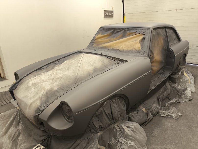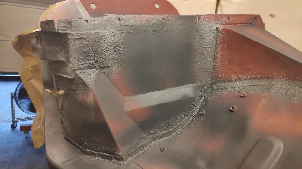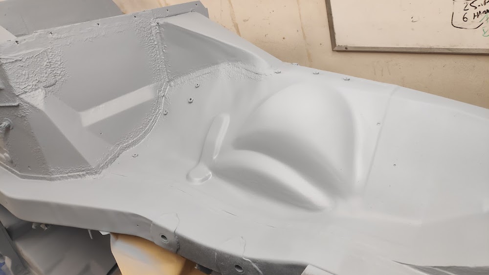 And finally the shell gets a coat of high build undercoat/primer. Any rub thrus were spotted with epoxy first.