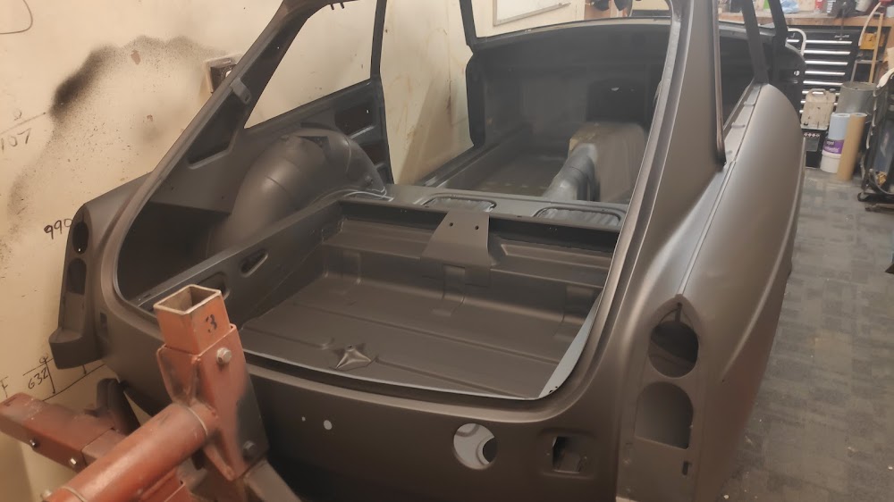 So back onto the rotisserie for perhaps the last time. Wings off, prep the underside and inside. The underside is so good it seems a shame to coat it with a textured stone chip finish so I decided to thin the Raptor coating and apply it with a gravity gun. It will still get the same level of protection but without a textured finish. Ant areas got a coat of epoxy sealer primer again, and now in a dark grey finish.