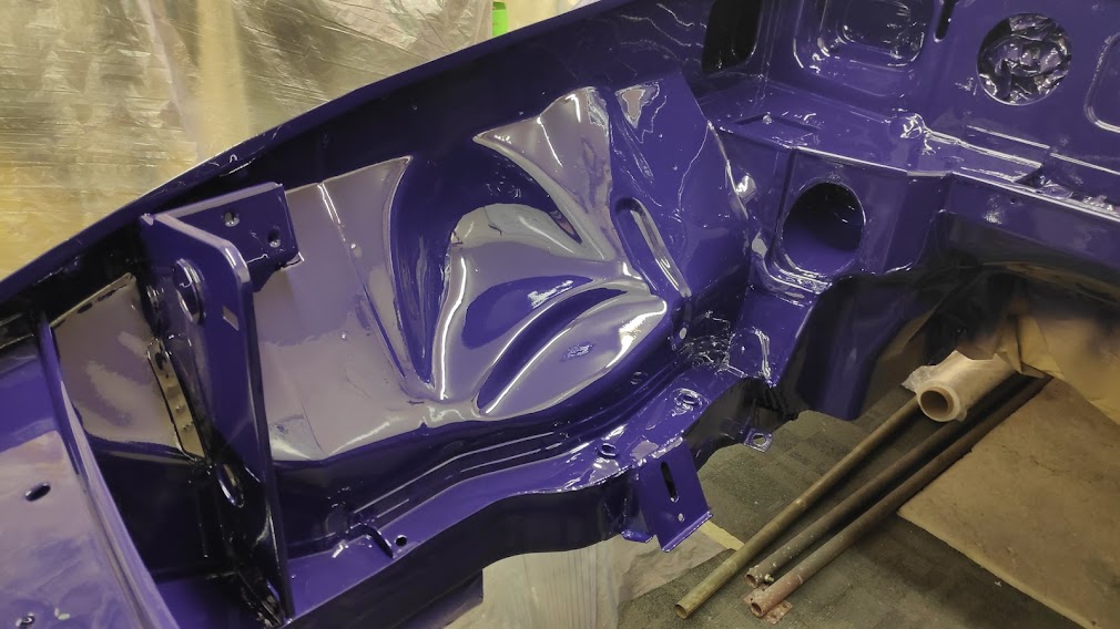And finally got a coat of paint on the engine bay. It’s always difficult to get into some of the corners as air won’t go into internal right angle corners due to the physics of the matter, and also its difficult to get the gun into engine bays, however a little tip I was shown years ago by an old school painter was to use the lining brush, I have a couple of squirrel hair types, I find them better than horse hair or synthetic, and to line in the corners with the top coat just before spraying, then the spray melds and merges with the lines areas to achieve a nice wet internal corner.