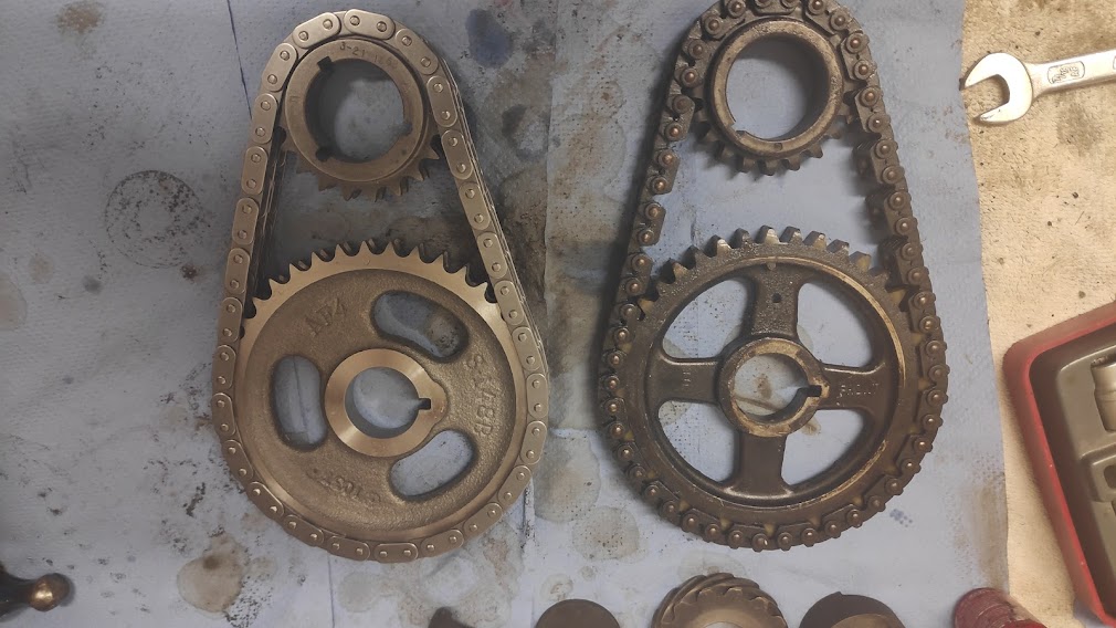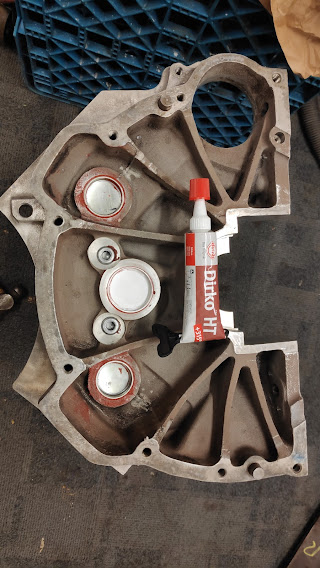 Decision was made to go with a Cloyes true roller timing chain and gear set up. Bit overkill but defo stronger and a bit less prone to wear that the nylon plastic gear normally fitted. Also the chain is a true roller type, as per the description really, rather than the link type fitted. Timing cover and water pump fitted and new lifters put into soak for 24hrs. Not in the pic are the new heav=y duty push rods. These are actually cheaper than the standard OE items, so it seems silly not to upgrade to these. Also new oil pump gears, pressure relief spring and plunger fitted, base packed with Vaseline and cover bolted up.