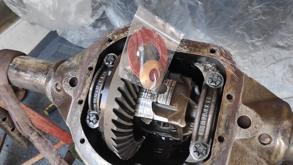 Axle got a good steam clean and then wire brush prior to spraying. Cover removed ready for the new copper shims and thrust washers, and fitted