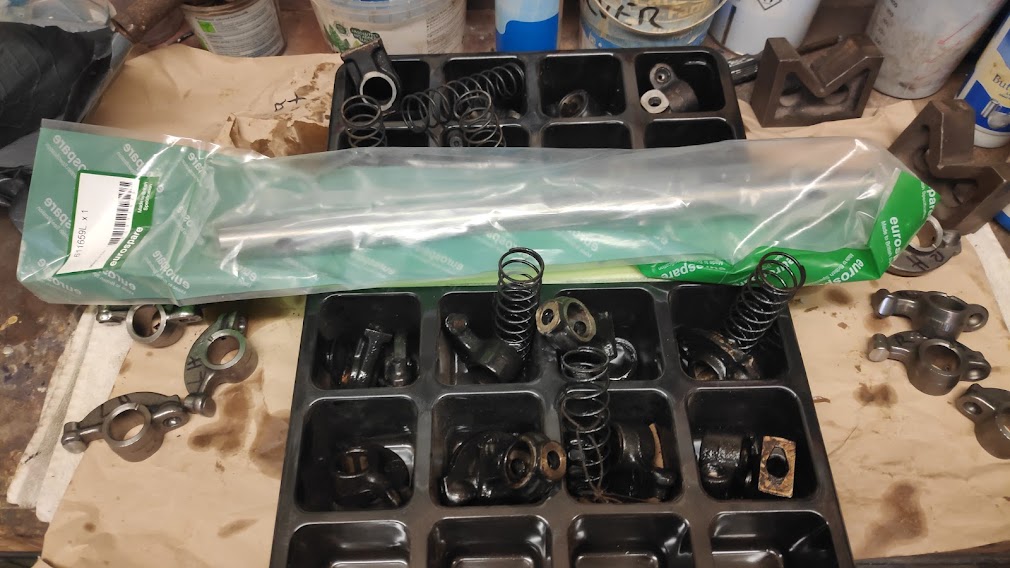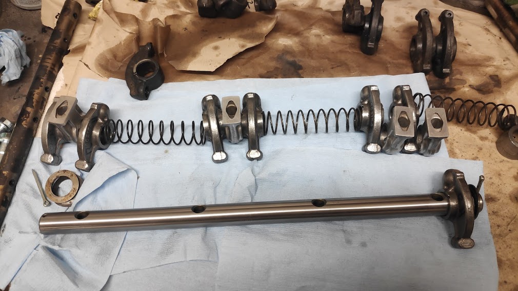 The rocker shafts and rockers were worn too far to recover, so new rockers and shafts were assembled, treated to a coat of engine assembly paste and readied to fit along with all of the engine bolts cleaned and zinc plated, or renewed.
